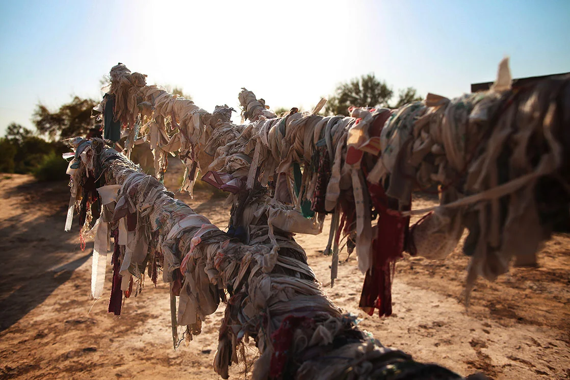 Important place of pilgrimage from the 12th century, the mausoleum of Muhammad Ibn Zayd differs from the others due to its ex-voto of shamanic origin. On a tree we can see pieces of cloth which are offerings to a god either in the hopes of a blessing, or as proof of gratitude for a blessing that already happened / Haut lieu de pèlerinage datant du XIIe siècle, le mausolée de Mohamed Ibn Zeid se distingue par la présence d’ex-voto d’origine chamanique. Sur un arbre sont accrochés des tissus ; offrandes à un dieu en demande d’une grâce ou en remerciement d’une grâce obtenue | TURKMENISTAN