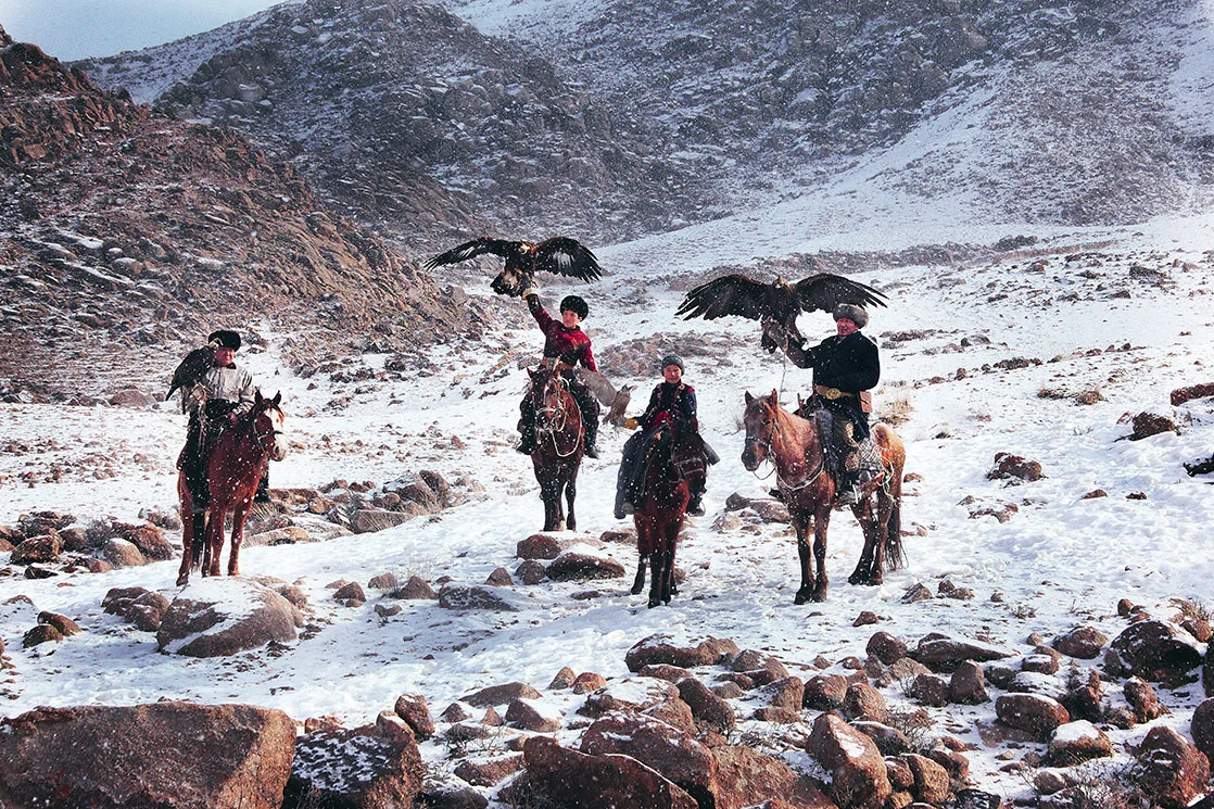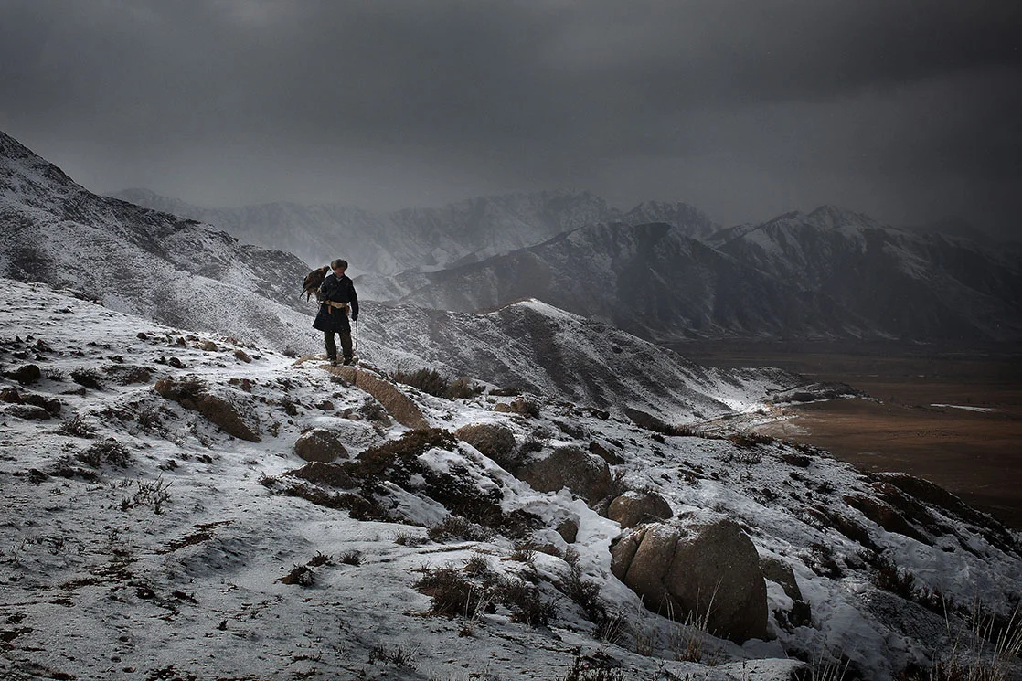 Scènes de chasse pendant l’hiver au Kirghizistan. A Bokonbayevo, il fait moins 25 degrés, mais les aigliers traquent quand même les loups et les renards. Chasseurs de génération en génération, les plus jeunes suivent leurs pères un faucon à bout de bras. On aperçoit, Azim, fier du haut de ses 10 ans malgré le froid. A sa gauche, son père Talgarbek, 39 ans, porte Toumara, un aigle femelle de quasiment deux mètres d’envergure | KIRGHIZISTAN