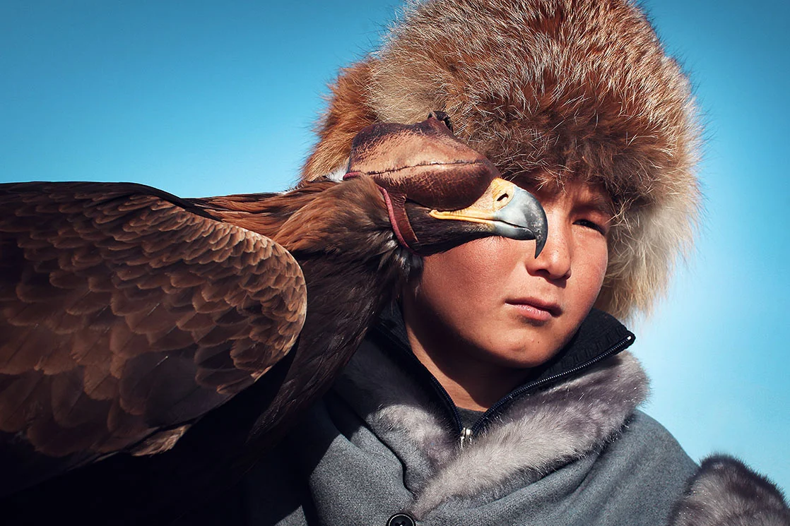 A young Kazakh falconer. His eagle’s eyes are covered by a tomoro, a leather mask intended to keep it from feeling stressed or recklessly attacking anyone / Jeune aiglier kazakh. Son rapace a les yeux recouverts d’un tomoro, un masque en cuir pour l’empêcher de stresser et d’attaquer sans discernemen | KAZAKHSTAN