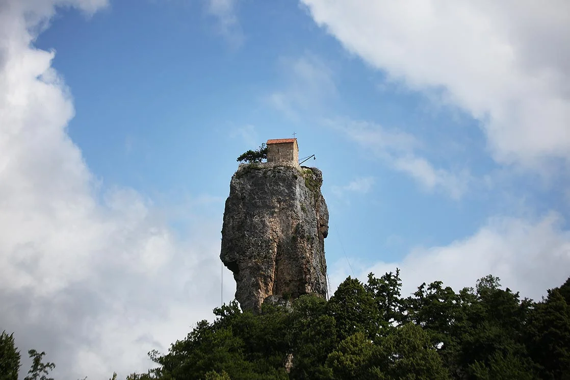 The Katskhi pillar is a natural limestone monolith located near the town of Chiatura. It is approximately 40 meters. The rock, with visible church ruins on its top surface, has been venerated by locals as the Pillar of Life, symbolizing the True Cross. The church dating from the 9th or 10th century | GEORGIA